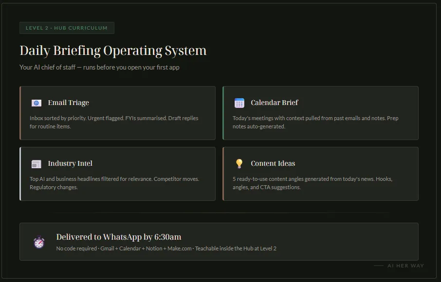 Choose Pro if: You want the energy and accountability of building alongside other women in real time, and you value watching a live, working AI operating system being built and iterated in front of you. The Build Club and Showcases are where "I understand this in theory" becomes "I've done this and it's running."