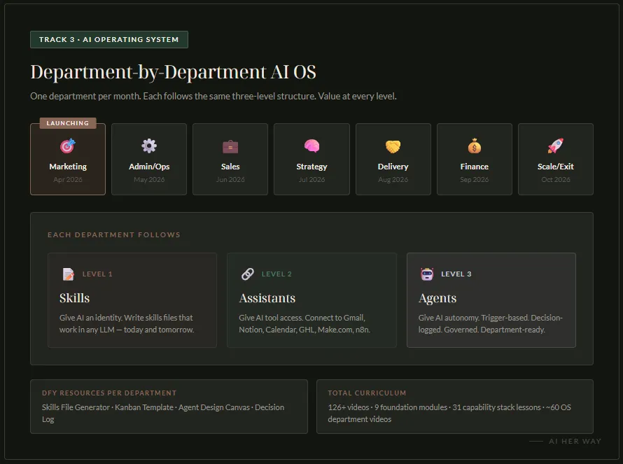 And here's the real differentiator: I'm literally the only woman teaching other women to build actual AI operating systems — not collections of GPTs marketed as "agents," not bots, but genuine infrastructure that drives your business. When you look at what everyone else is teaching, and then you look under the hood, it's prompts. This is not that.